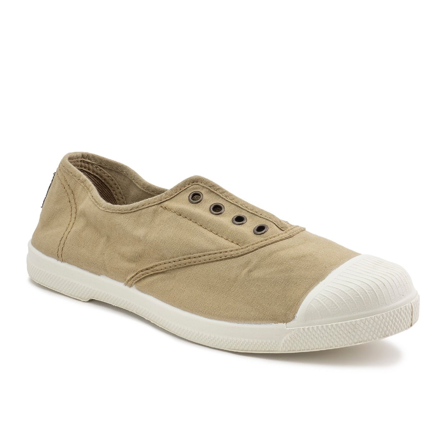 Natural World brings you the perfect blend of style, comfort, and sustainability with these classic slip-on shoes in beige (Camel). Made from 100% organic cotton and natural rubber, these shoes prioritize both the environment and your comfort. Featuring a timeless, minimalist design with metal eyelets and a durable rubber toe cap, they are ideal for everyday wear. Produced using traditional vulcanization processes, these shoes are vegan, eco-friendly, and ethically made in Spain, offering you a chic, conscious choice for any occasion.