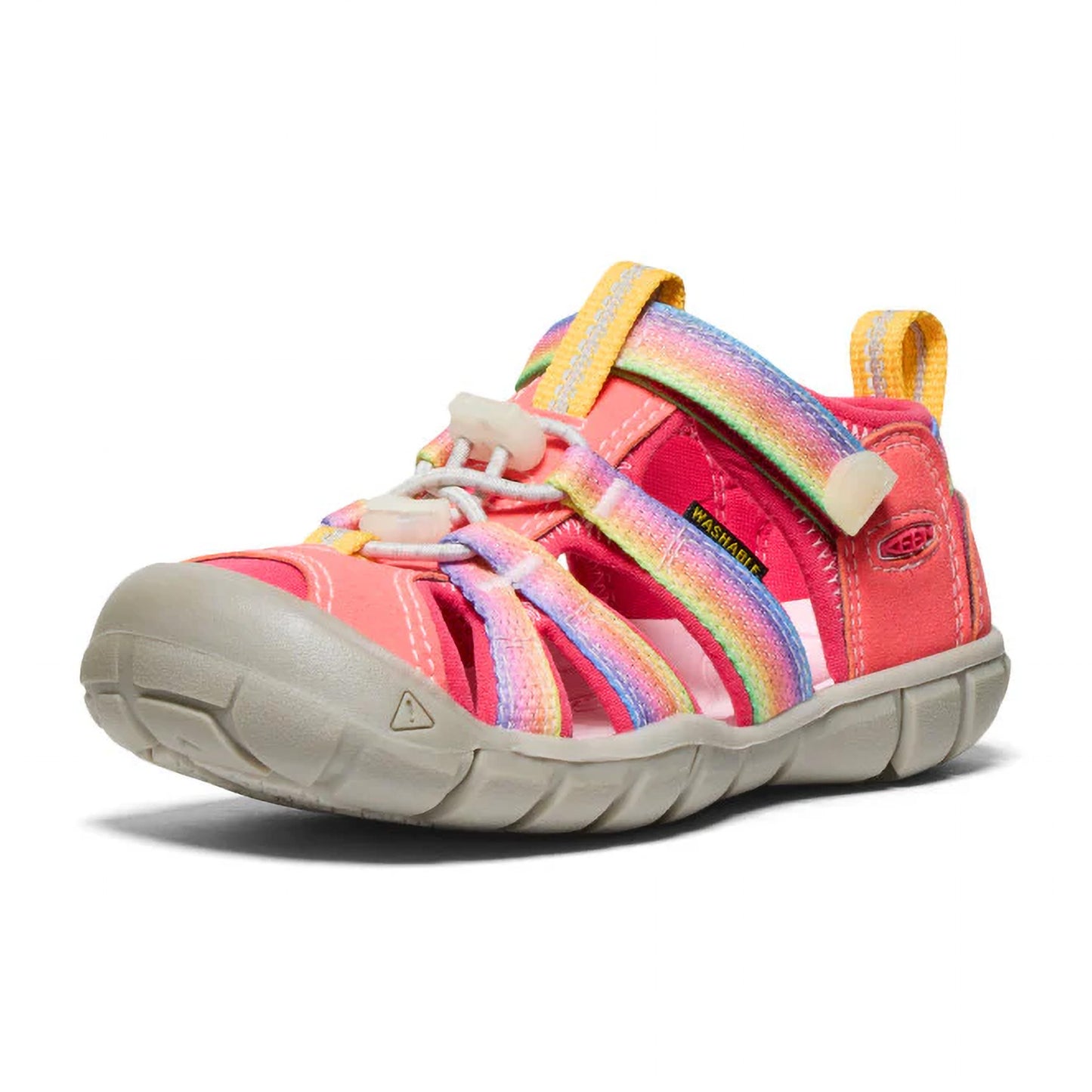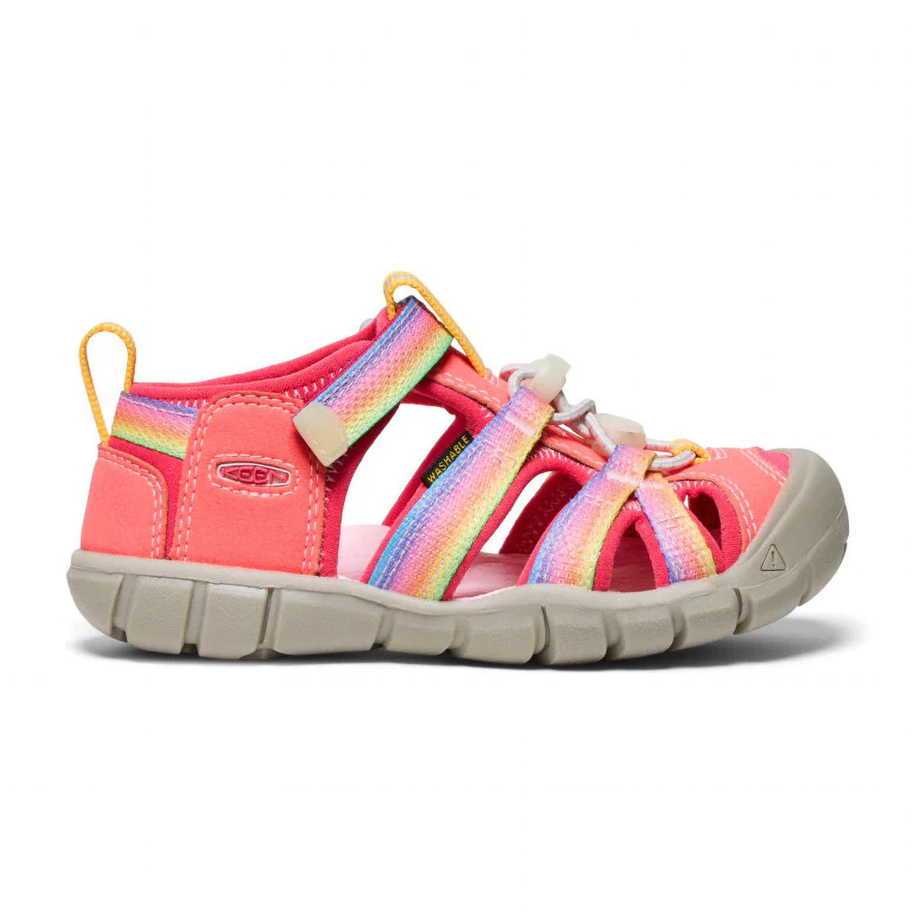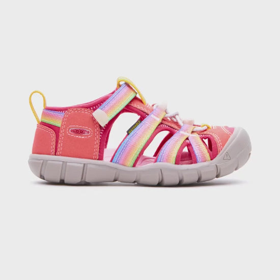 Discover the Keen Seacamp Kids Sandals in in Rainbow Glow, the ultimate hybrid water sandal for active kids who love to make a splash. These machine-washable, waterproof sandals feature KEEN.CNX technology for lightweight flexibility, a non-marking grippy rubber sole for unbeatable traction, and KEEN's Secure Fit Lace Capture System for a snug, customizable fit. With their rugged design and unparalleled performance, your young adventurers will be ready to conquer both land and water in comfort and style.