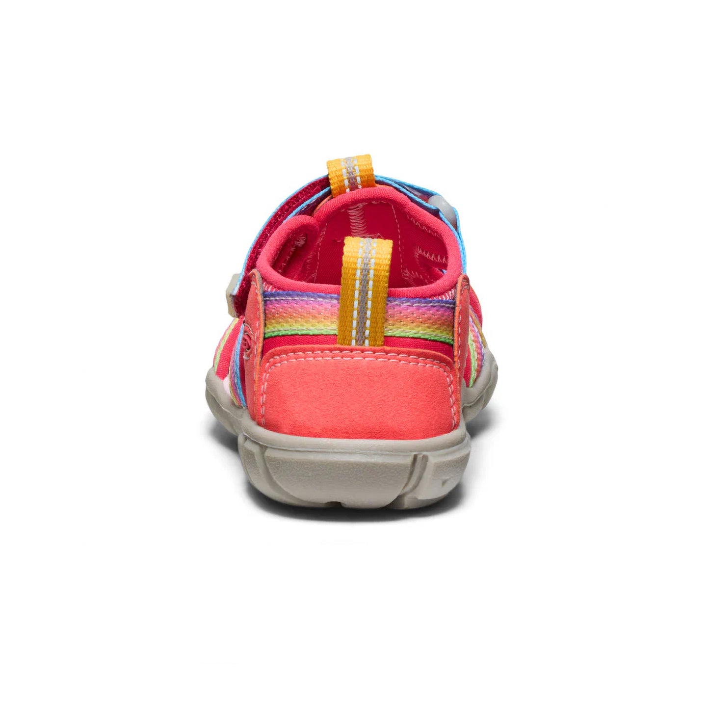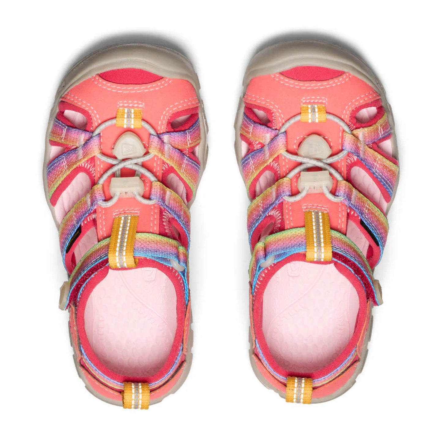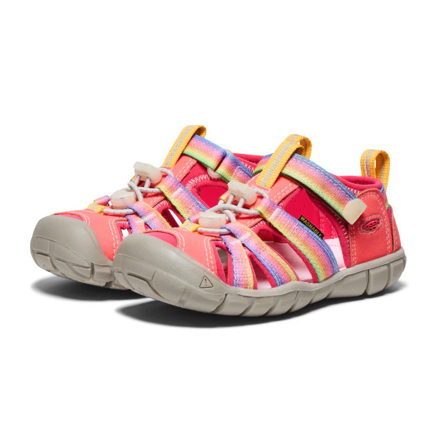 Discover the Keen Seacamp Kids Sandals in in Rainbow Glow, the ultimate hybrid water sandal for active kids who love to make a splash. These machine-washable, waterproof sandals feature KEEN.CNX technology for lightweight flexibility, a non-marking grippy rubber sole for unbeatable traction, and KEEN's Secure Fit Lace Capture System for a snug, customizable fit. With their rugged design and unparalleled performance, your young adventurers will be ready to conquer both land and water in comfort and style.