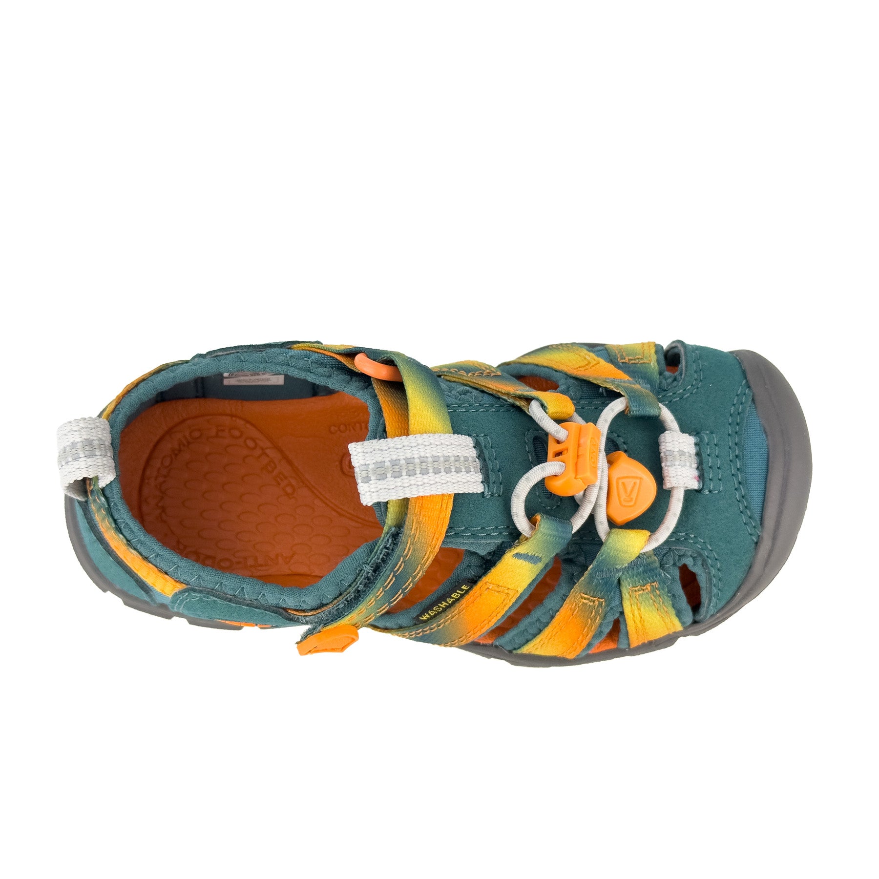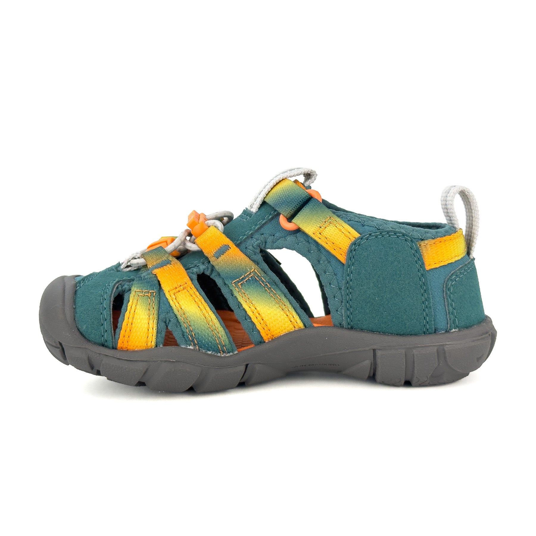 KEEN Seacamp Sandals (Ombre Mediterranea) are built for boys who bounce between the beach, the park, and everything in between. This popular KEEN kids’ sandal combines quick-drying, washable materials with the iconic rubber toe bumper, so little feet stay protected during splashy adventures and busy playdates. The easy bungee-lace system and secure strap help you dial in a snug fit fast, while the cushioned footbed and grippy outsole keep every step comfortable and steady. Finished in the fresh new Ombre Mediterranea colourway, it’s a fun, sporty choice for everyday exploring.