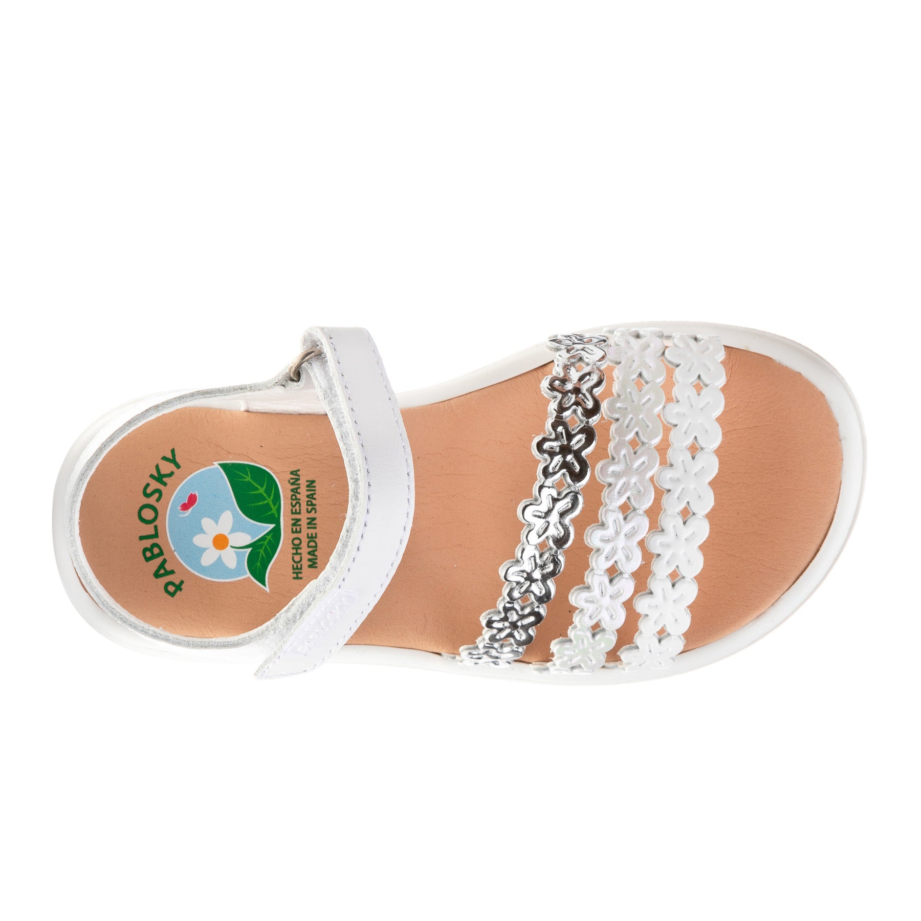 Pablosky Olimpo Blanco sandals add a touch of playful charm to warm-weather outfits. Crafted in smooth white leather, they feature three delicate straps decorated with dainty flower motifs in white and silver for a subtle sparkle. The soft InTech lining keeps little feet fresh and comfortable, while the superabsorbent and antibacterial insole promotes excellent hygiene throughout the day. A lightweight, flexible sole ensures easy movement for everyday adventures. Free delivery in Singapore for orders over $79.