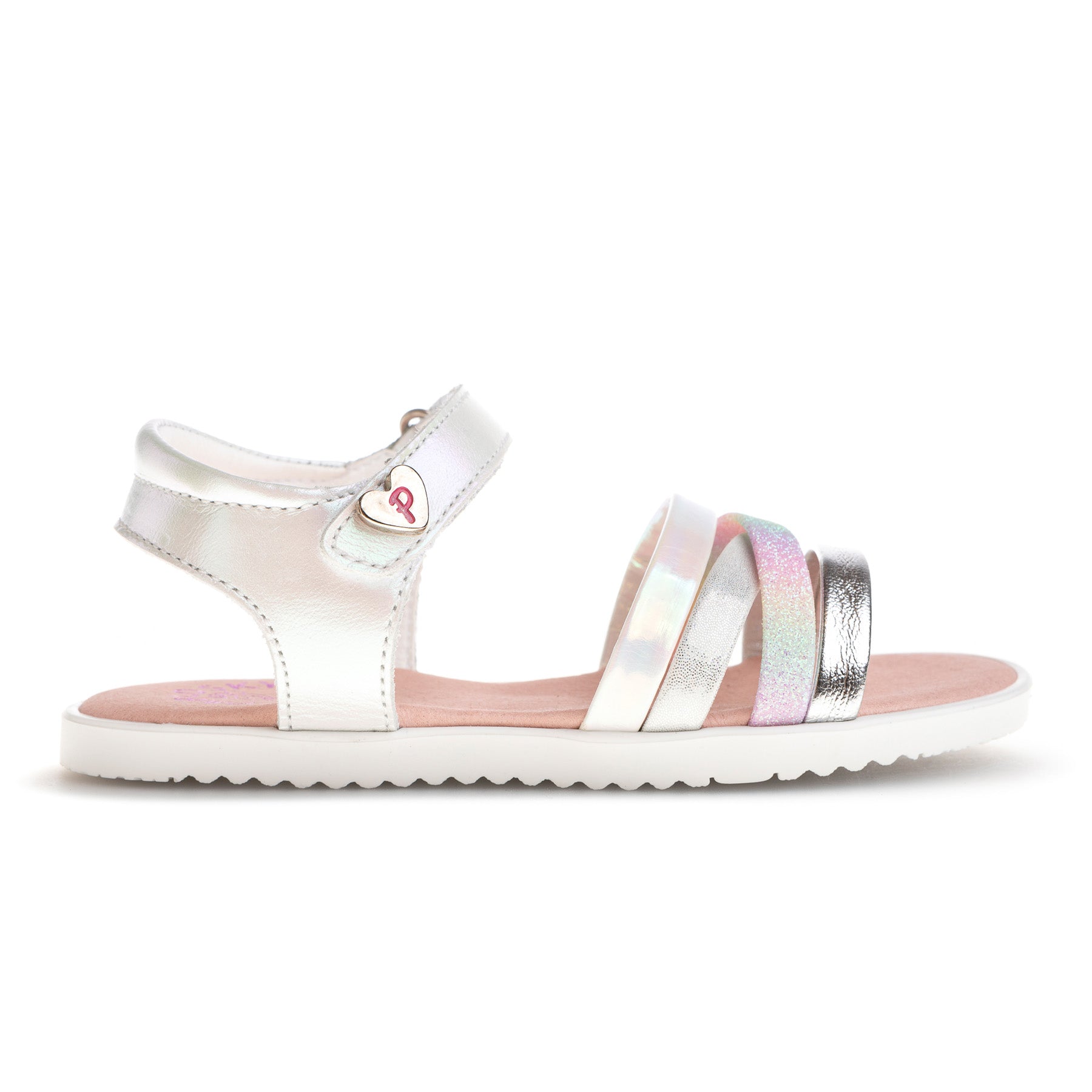 - White leather upper with metallic, iridescent, and glitter straps for a playful finish