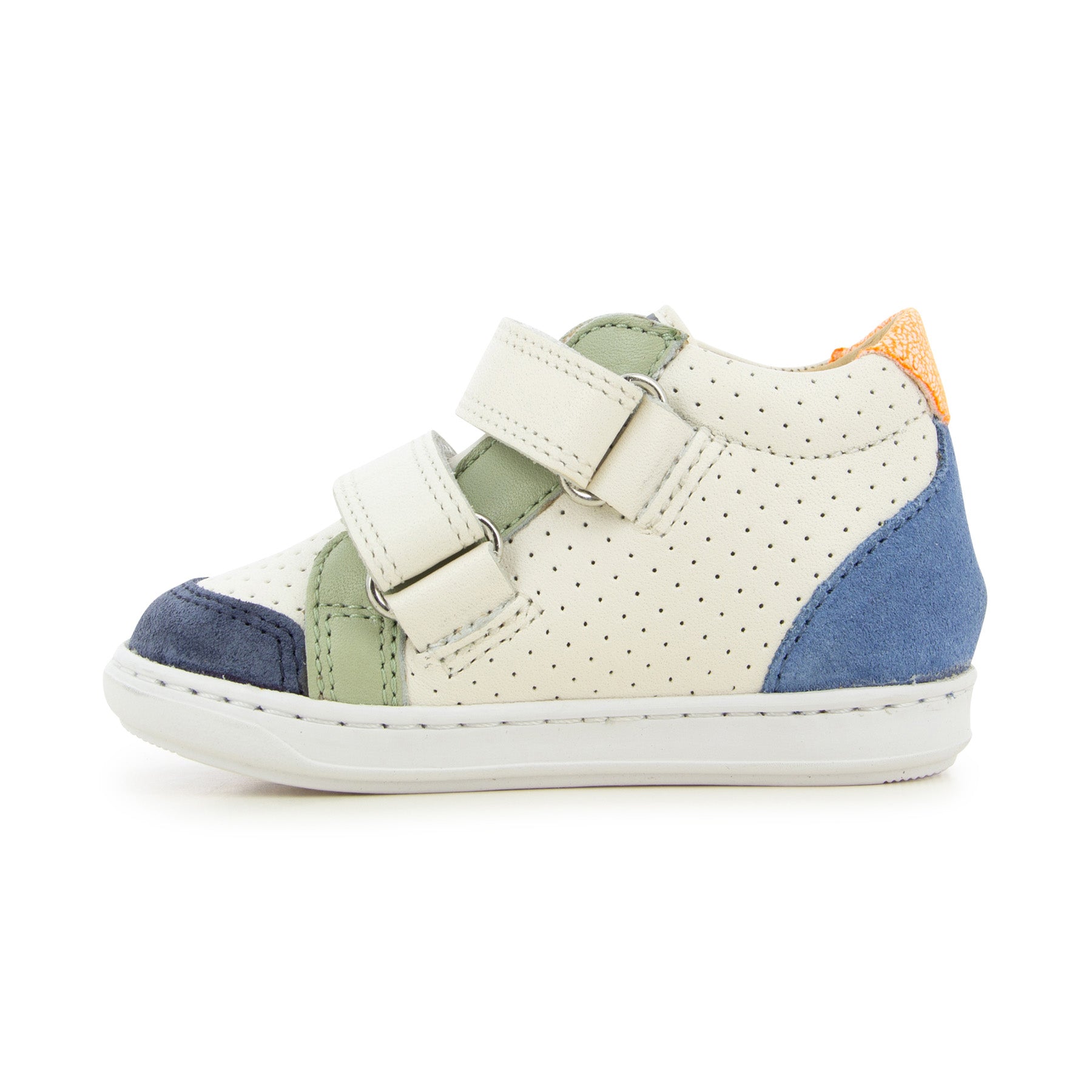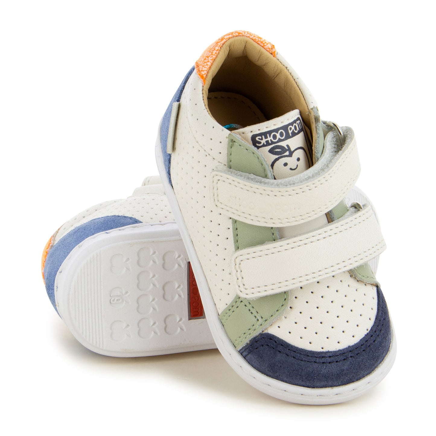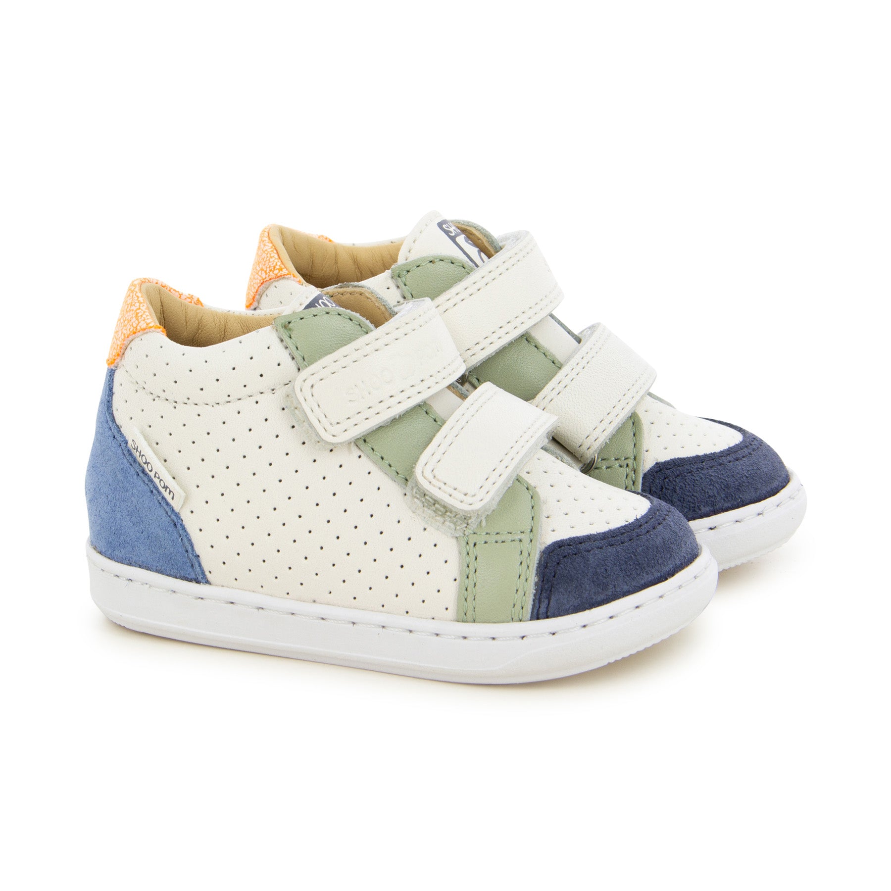Shoo Pom Bouba Box Easy shoes in Craie Blue bring a fresh, sporty look to early walkers with perforated off-white leather panels, cool sage overlays, and contrasting denim-blue suede touches at the toe and heel. The premium full-leather build surrounds little feet in breathable comfort, while a padded collar and cushioned insole provide gentle support during first adventures. Two broad hook-and-loop straps make it simple for parents to dial in a secure, custom fit, and the lightweight rubber sole flexes naturally for confident traction on playground surfaces. Designed in France and finished with meticulous stitching, this high-top silhouette delivers the quality and style parents expect from Shoo Pom. Free delivery in Singapore for orders over $79.