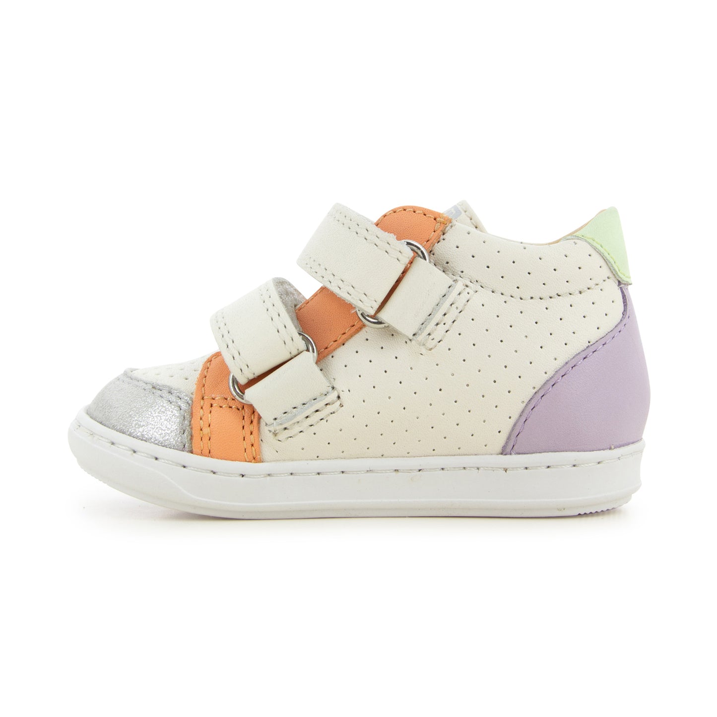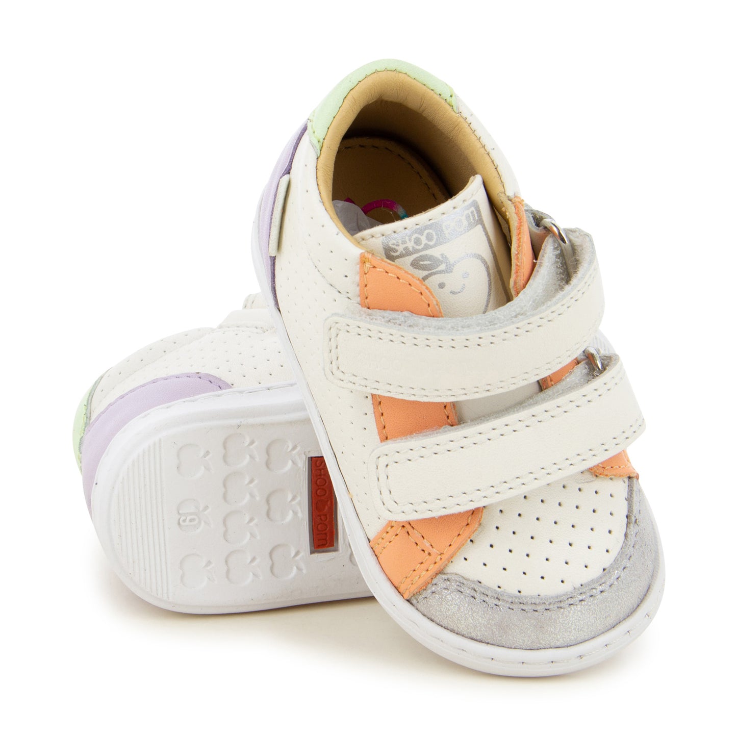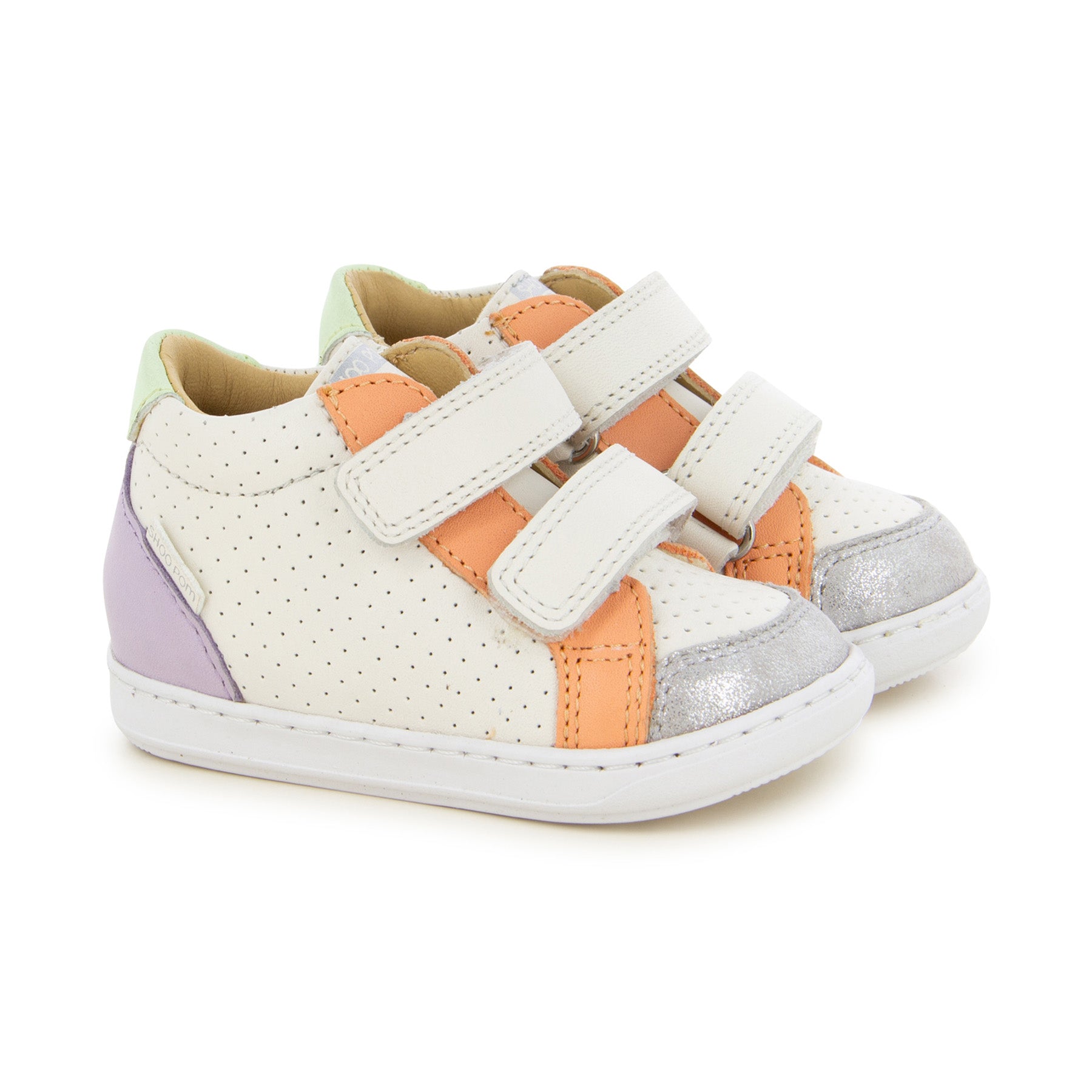 Shoo Pom Bouba Box Easy toddler shoes in Peach Lilac showcase French flair with perforated ivory leather, peach colour-block straps and pastel lilac and mint accents. Crafted entirely from supple full-grain leather, the high-top design cushions growing feet with a breathable leather lining and padded ankle collar. Two wide hook-and-loop straps make independent dressing simple, while the lightweight, flexible rubber outsole gives early walkers steady traction at playgroup or on weekend outings. Shoo Pom’s meticulous stitching, premium materials and playful palette combine to deliver lasting quality and standout style. Free delivery in Singapore for orders over $79.