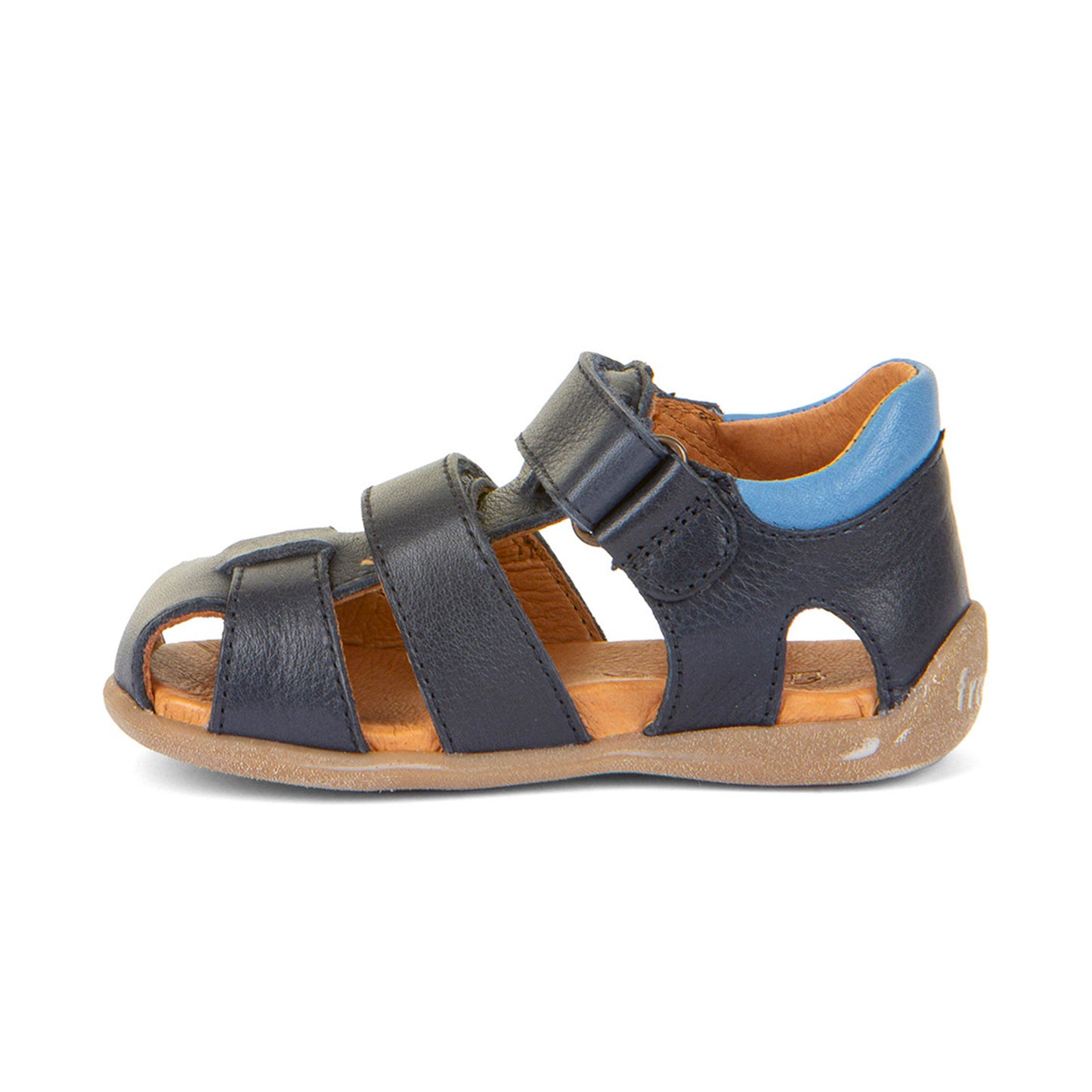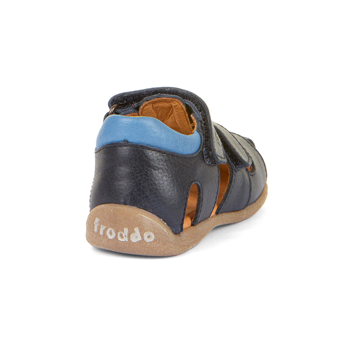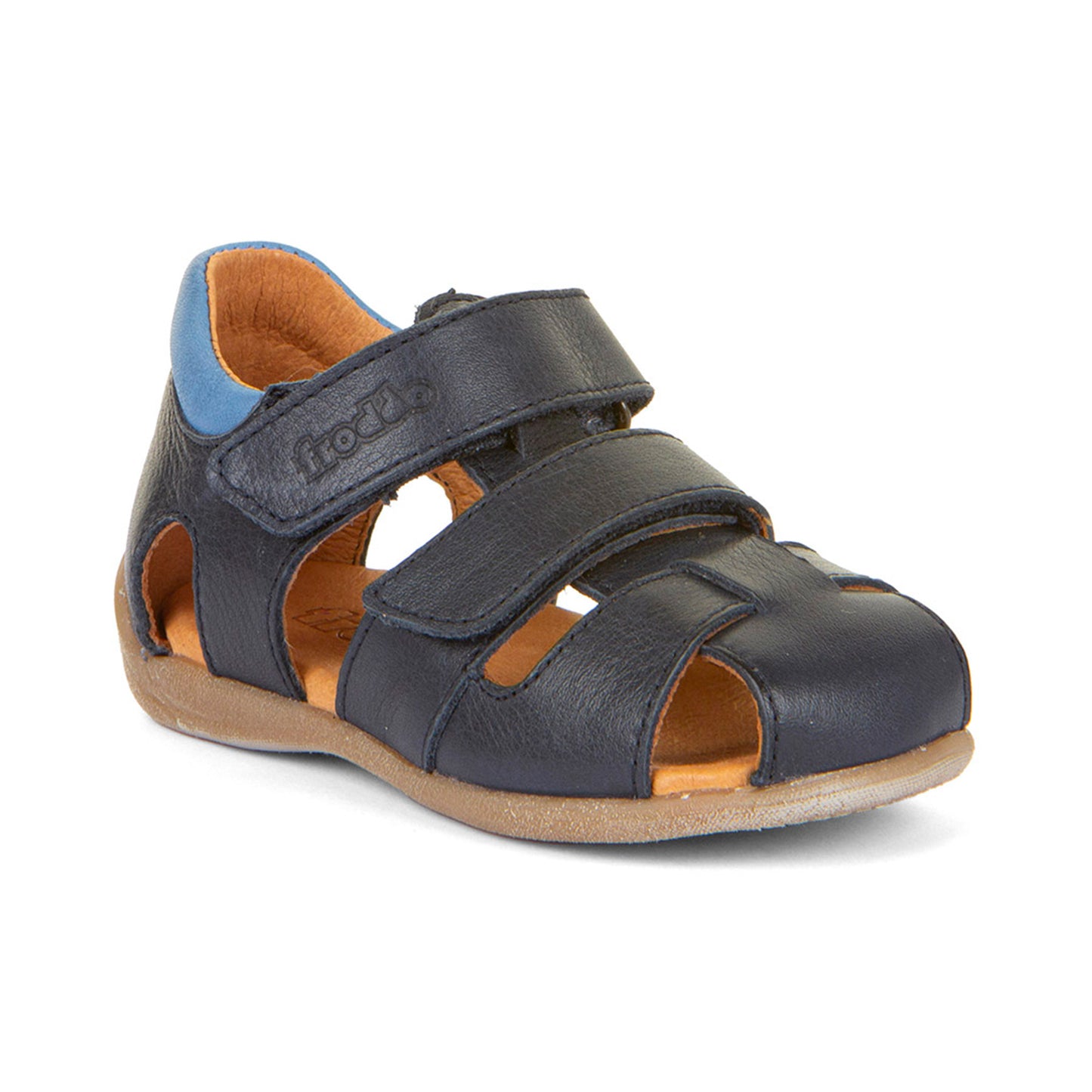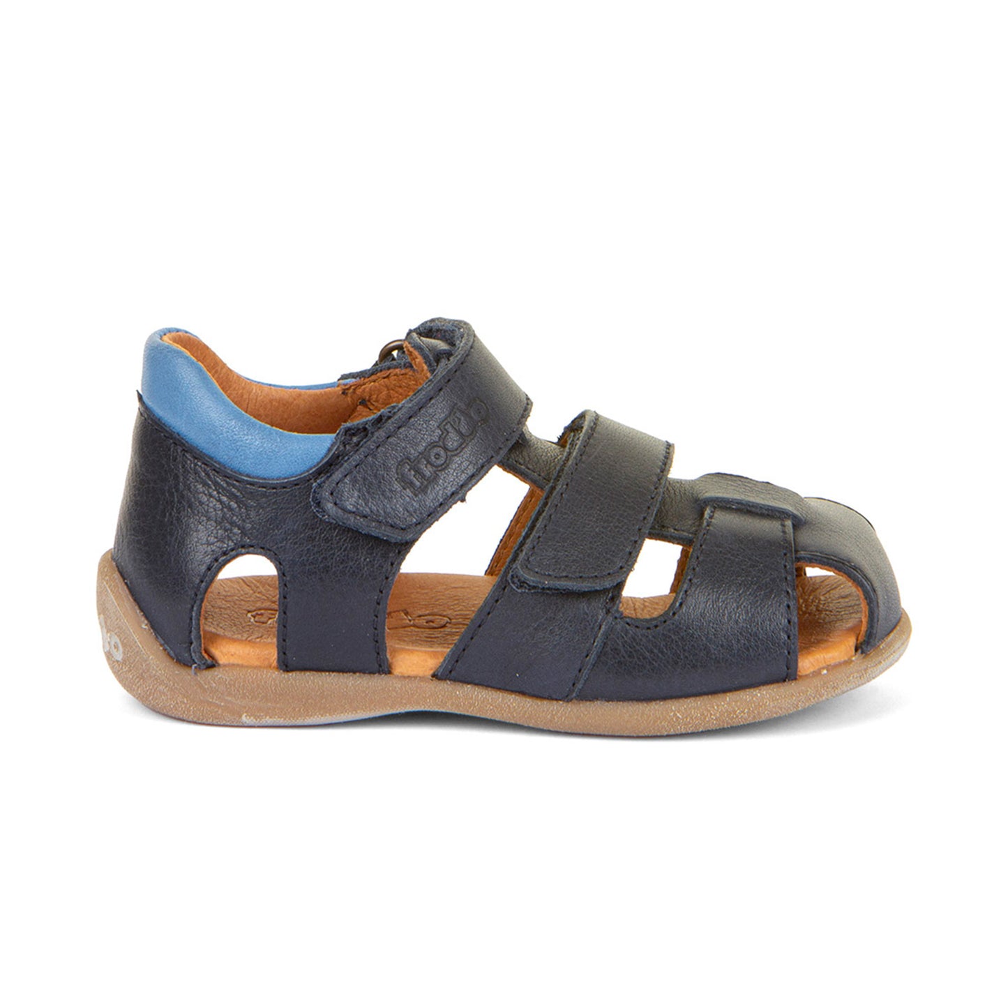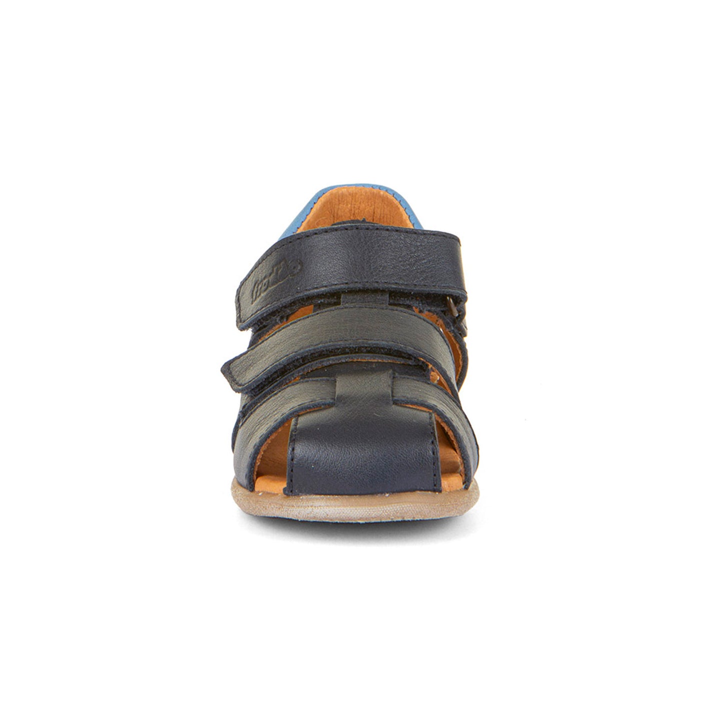 Keep your toddler's feet comfortable and protected with the Froddo Carte sandal in classic navy with sky blue accent. This timeless closed-toe sandal combines premium leather construction with thoughtful design features, including a cushioned, gently contoured footbed for optimal support. Two adjustable velcro straps ensure a secure fit while making it easy for parents to put on and take off.