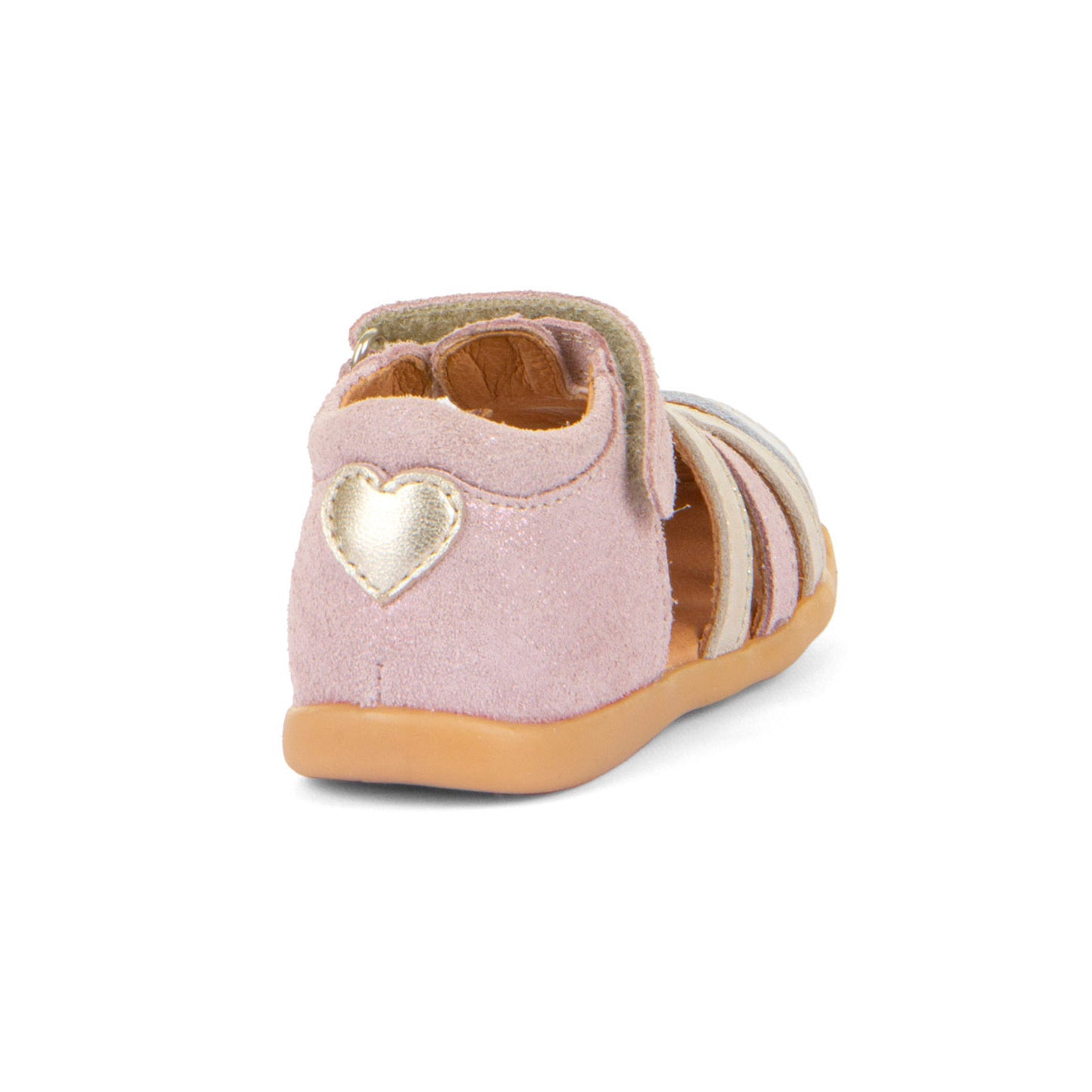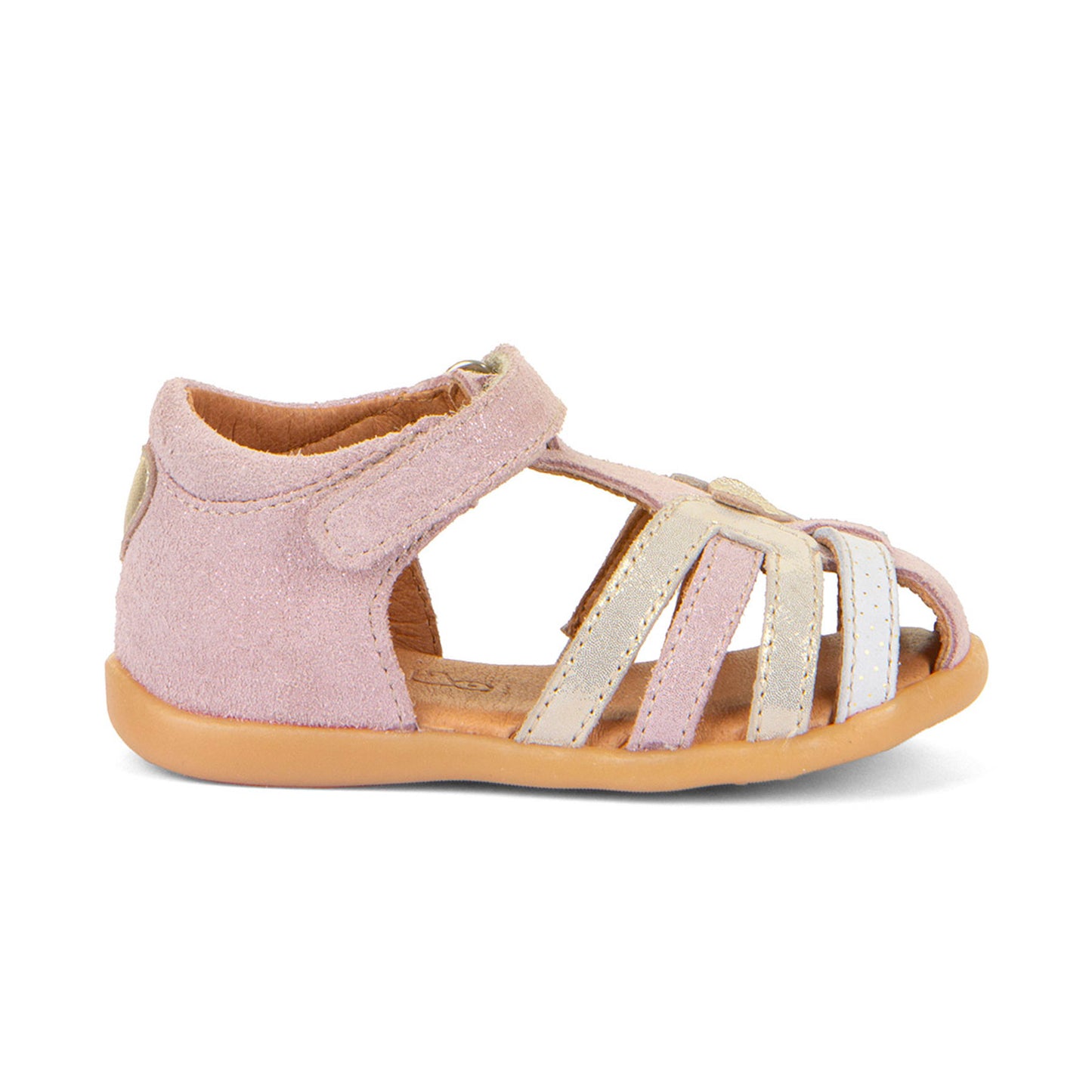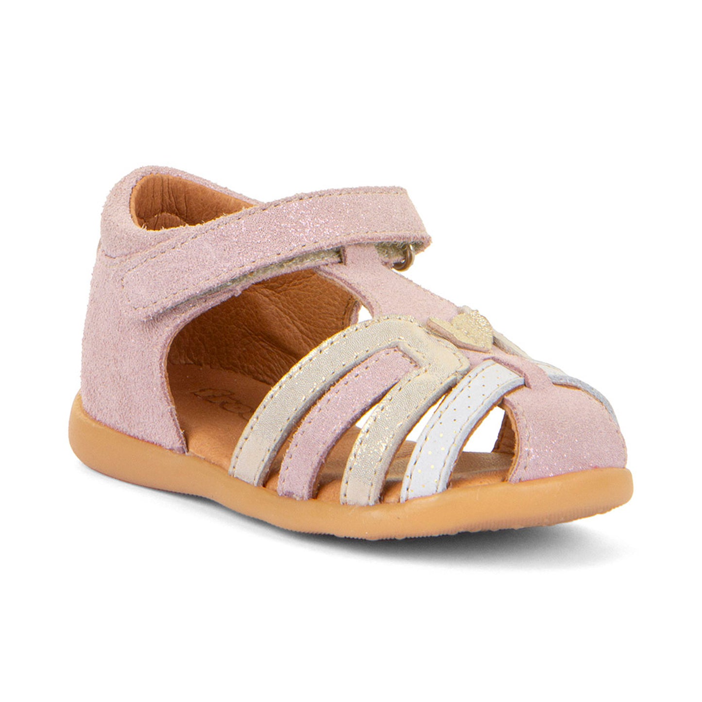 Make every step sparkle with Froddo Daisy toddler sandals in Pink Shine, crafted from a mix of shimmering suede and smooth leather for softness and durability. The cushioned leather footbed supports developing arches, while the updated super flexible outsole bends naturally for confident, healthy movement. A closed heel keeps little ankles stable, and the easy Velcro strap lets you adjust the fit in seconds. Finished with subtle metallic stripes and a tiny heart accent, these sandals combine playful style with reinforced stitching, child-safe materials, and slip-resistant grip to deliver trusted comfort, quality, and safety all summer long.
