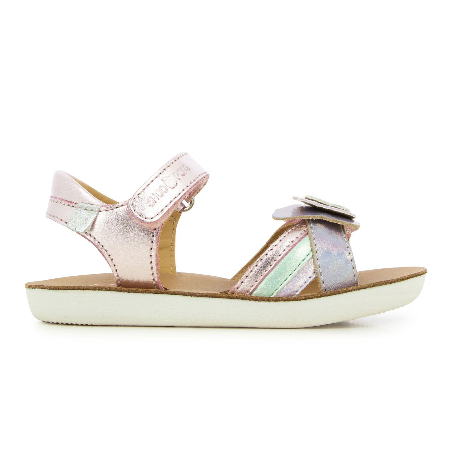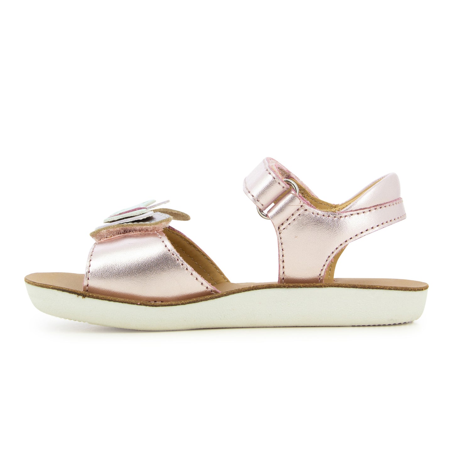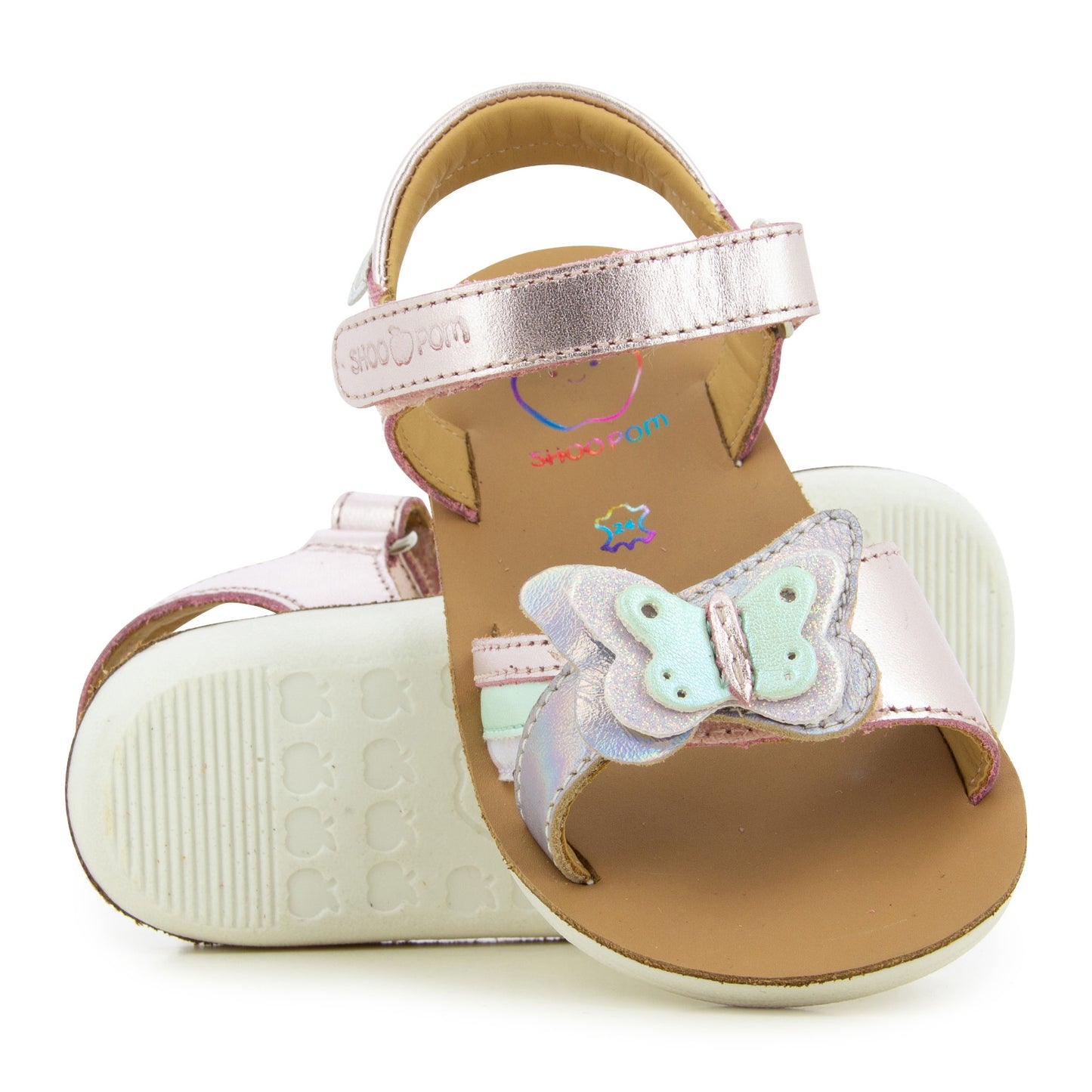 Shoo Pom Goa Fly sandals in Crystal Pink sparkle with fairy-wing charm and luxurious French craftsmanship. The gleaming pastel leather upper is gentle on young skin yet resilient for daily play, while the smooth leather footbed cushions every step. A glittery butterfly accent catches the light, turning each outing into a style moment, and the velcro ankle strap helps children secure the fit all by themselves. Finished with a feather-light rubber sole that bends naturally with the foot, this premium pair showcases Shoo Pom’s dedication to quality materials, meticulous stitching and child-safe comfort.