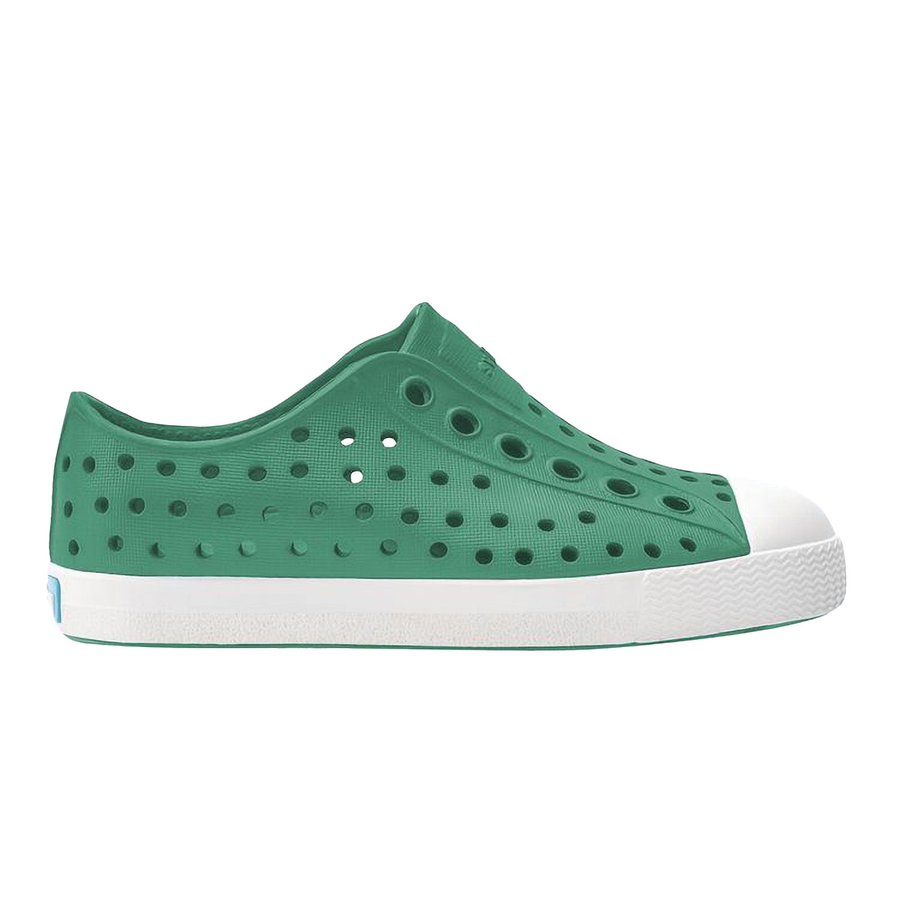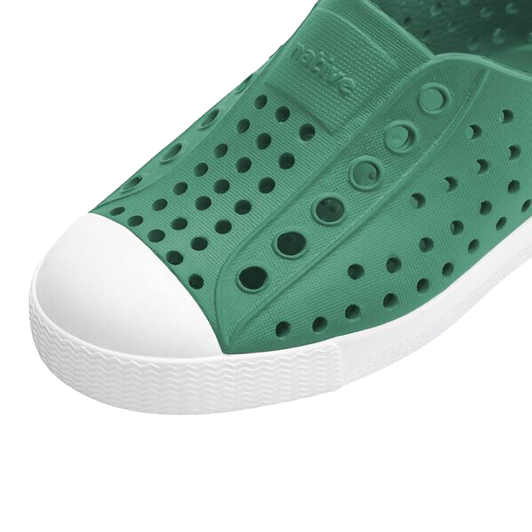 Native Jefferson in Alpine Green brings a fresh, sporty look to everyday play. The classic Jefferson silhouette is made from ultra-lightweight EVA that cushions each step and stays comfortable through heat, splashes, and playground adventures. Perforations across the upper keep little feet cool, while the odor-resistant, hand-washable build makes cleanup simple. A sturdy white toe cap adds protection and durability, and the easy slip-on design means kids can get out the door fast.