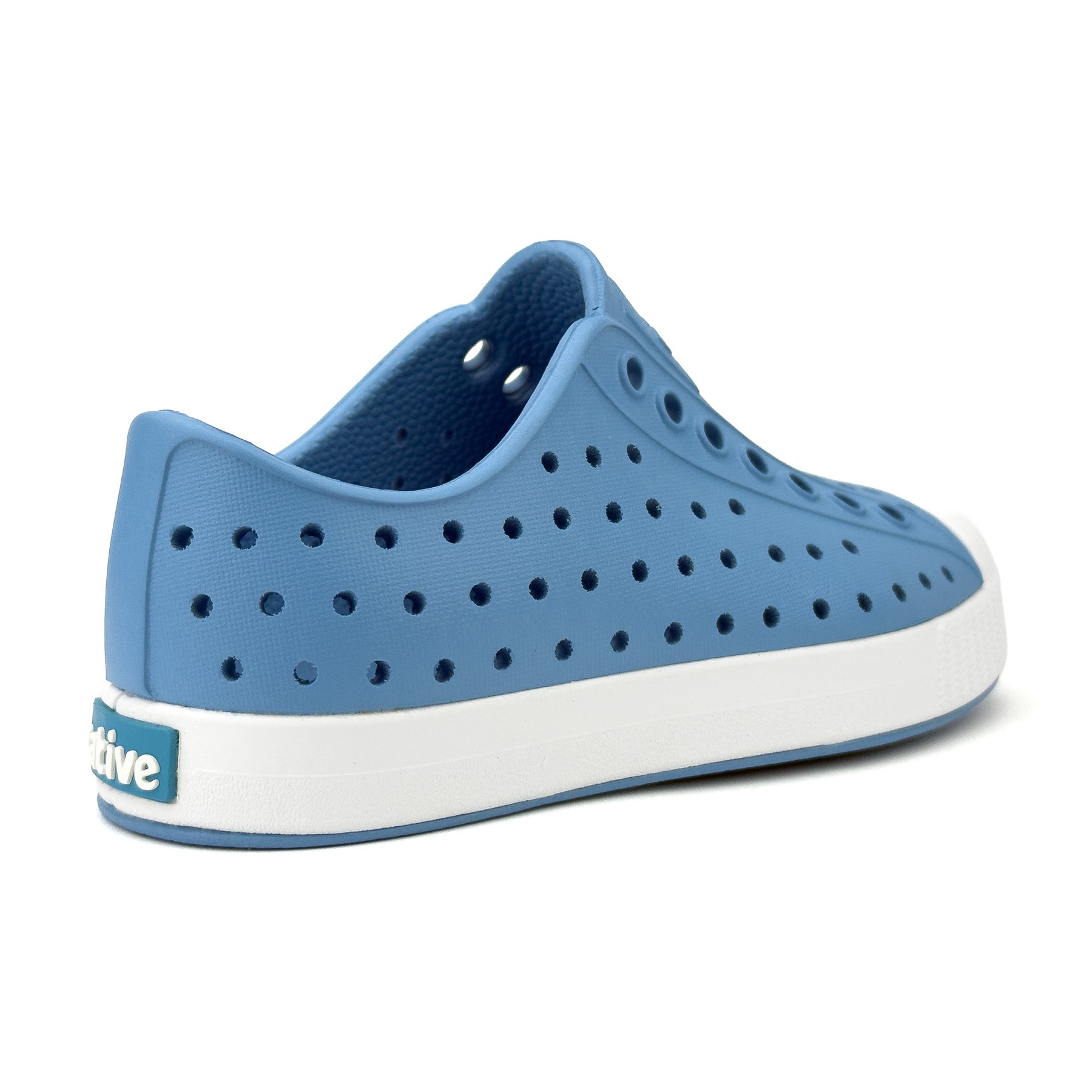 Native Jefferson in Aquarius Blue delivers a clean, sporty look with everyday comfort kids love. Crafted with Sugarlite™, Native’s sugarcane-based EVA, this lightweight and water-friendly shoe keeps little feet cool thanks to breathable perforations and a cushioned feel that works for school days, playground time, and weekend outings. The odor-resistant, hand-washable construction makes maintenance easy, while the contrasting white toe cap adds durability and protection. Slip-on styling means kids are ready to go in seconds.