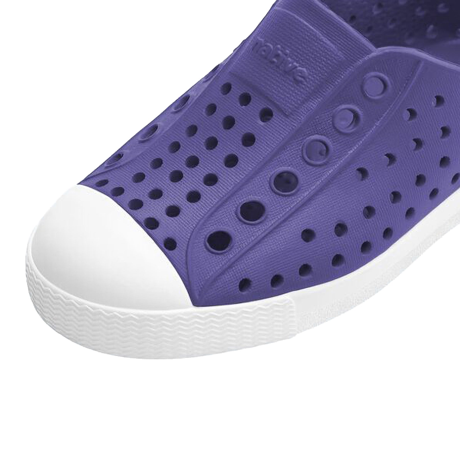 Native Jefferson in Punk Purple brings bold colour and everyday comfort to active kids. The classic Jefferson silhouette is made from ultra-lightweight EVA that cushions each step and stays cool with breathable perforations. It is odor-resistant, quick to rinse clean, and water-friendly for park days, school runs, and splashy weekends. A sturdy white toe cap adds extra protection, while the easy slip-on design helps little ones get ready fast.