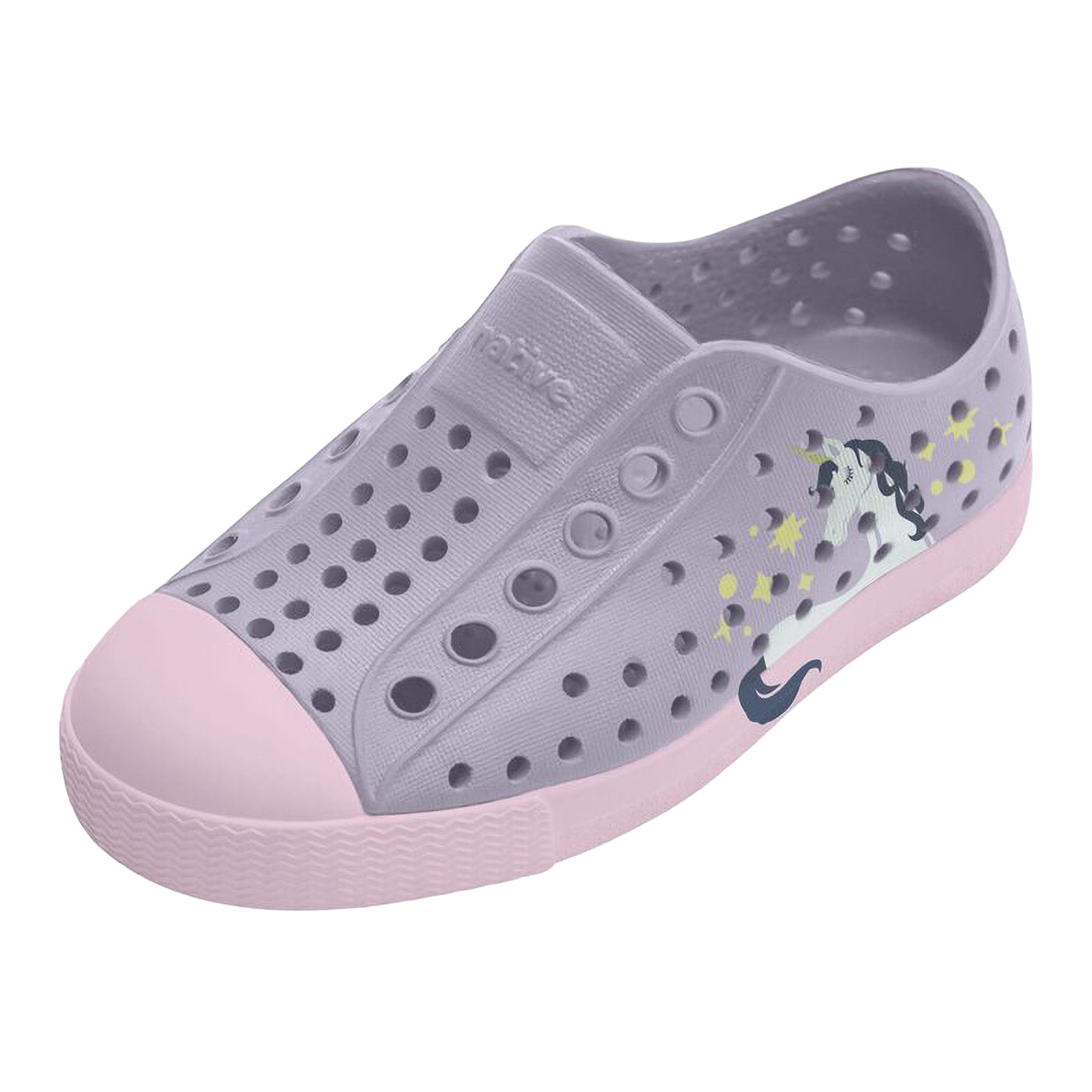 Native Jefferson Block in Future Purple / Unicorn brings a little magic to busy days, pairing a soft purple upper with a pastel pink toe cap and a charming unicorn and stars motif. Made with Sugarlite™ (a sugarcane-based EVA) for a lighter footprint, this water-friendly classic stays comfy and cool thanks to breathable perforations and cushioned support. The odor-resistant, hand-washable build makes cleanup simple after park play and puddle jumps, while the easy slip-on design and protective toe cap keep little feet adventure ready.