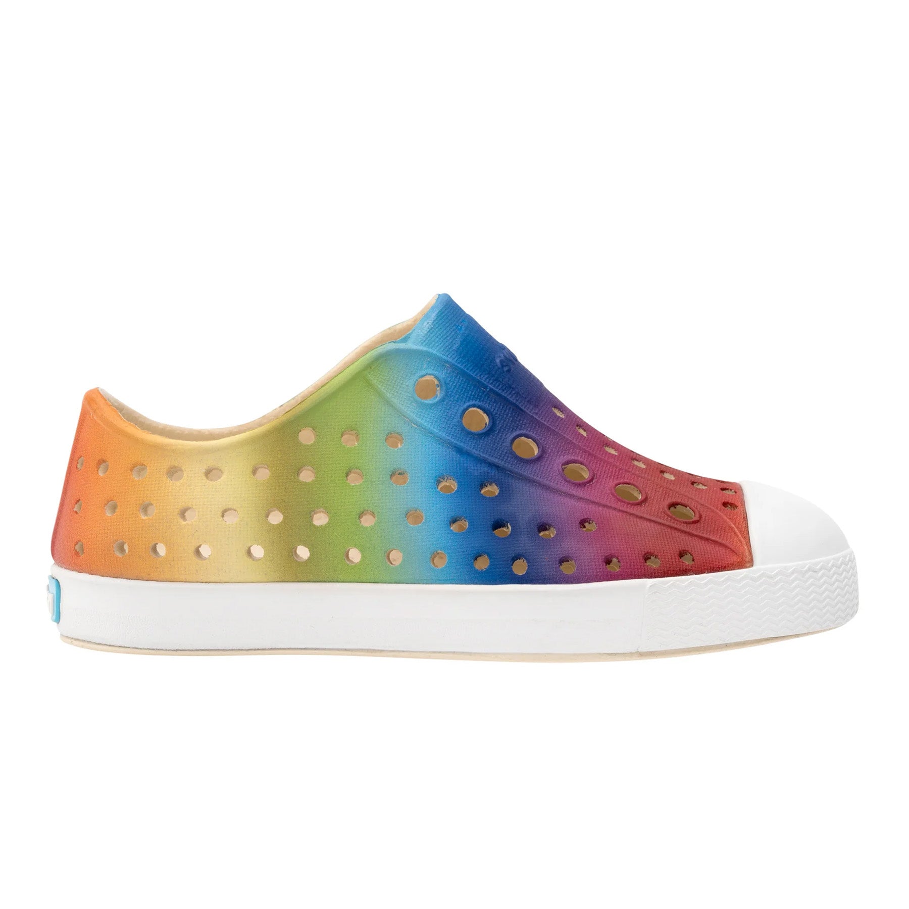 Native Jefferson Print in Rainbow Gradient brightens every outing with a joyful ombré of red, blue, green, and gold across the classic Jefferson silhouette. Made from ultra-lightweight EVA, this water-friendly pair keeps little feet cool with breathable perforations and a soft, cushioned feel for all-day play. The odor-resistant, hand-washable build makes cleanup simple, while the sturdy white toe cap adds durability. Easy slip-on styling means kids are ready for school, park days, and splashy weekends in seconds.