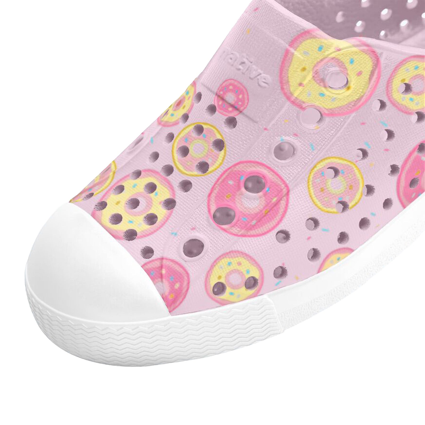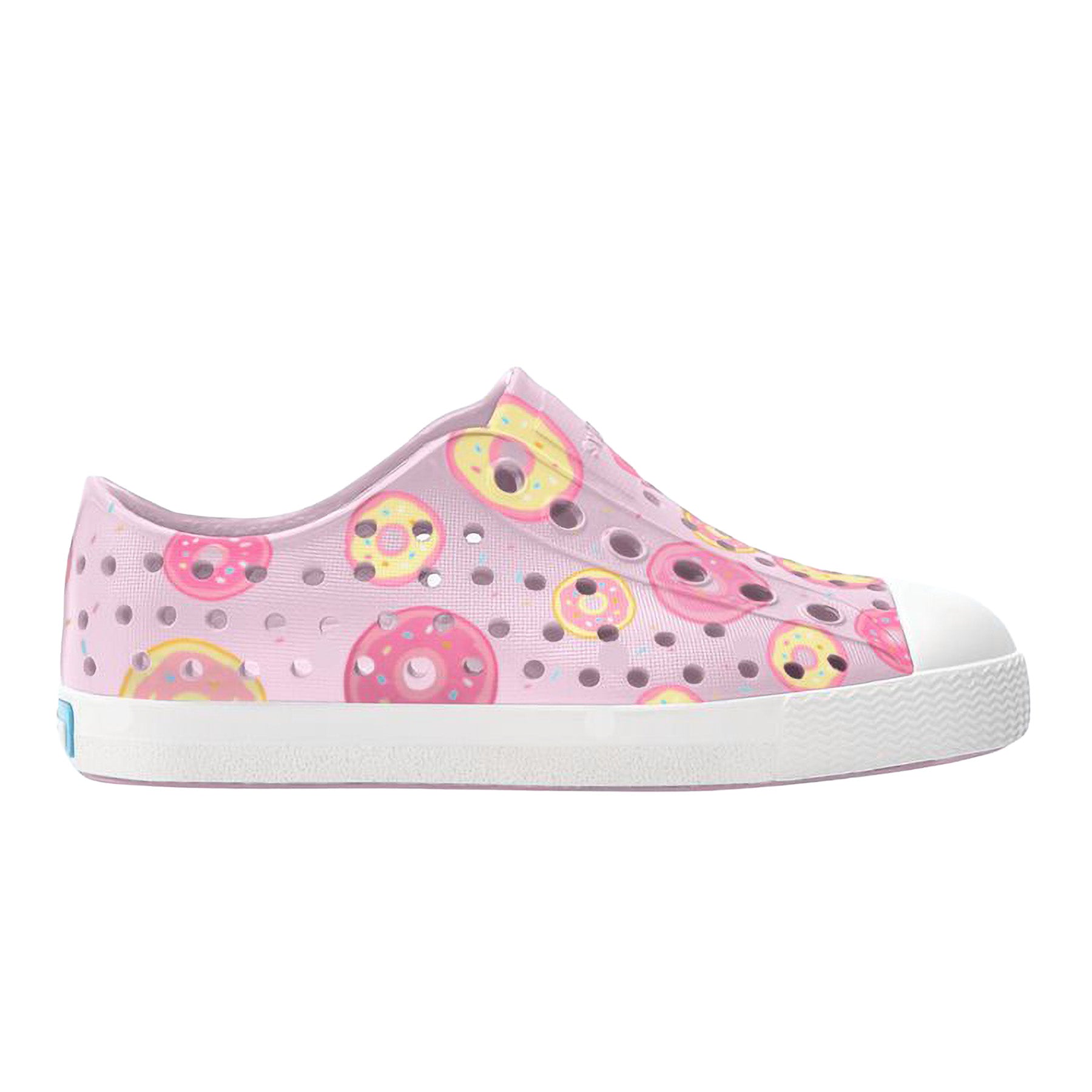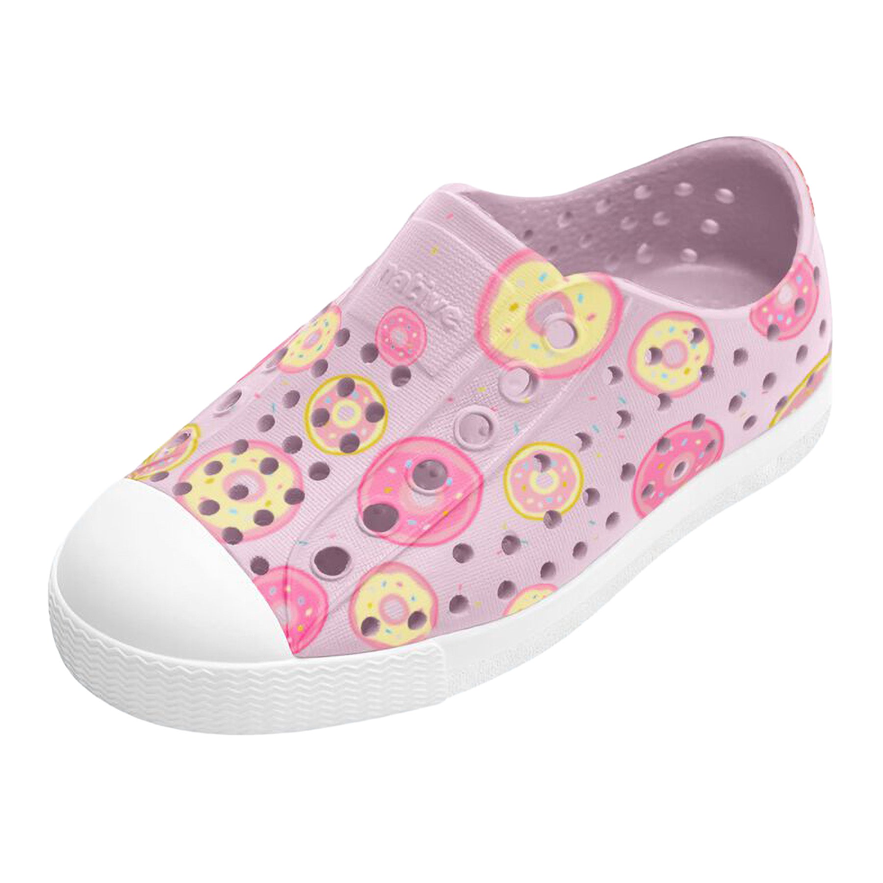 Native Jefferson Print in Barely Pink / Donuts sweetens everyday adventures with a playful sprinkle donut pattern on a soft pink backdrop. Made from ultra-lightweight EVA, this water-friendly classic keeps little feet cool with breathable perforations and a cushioned feel for school, park days, and splashy weekends. The odor-resistant, hand-washable build makes cleanup easy, while the sturdy white toe cap adds durability. Slip-on styling helps kids get out the door fast.