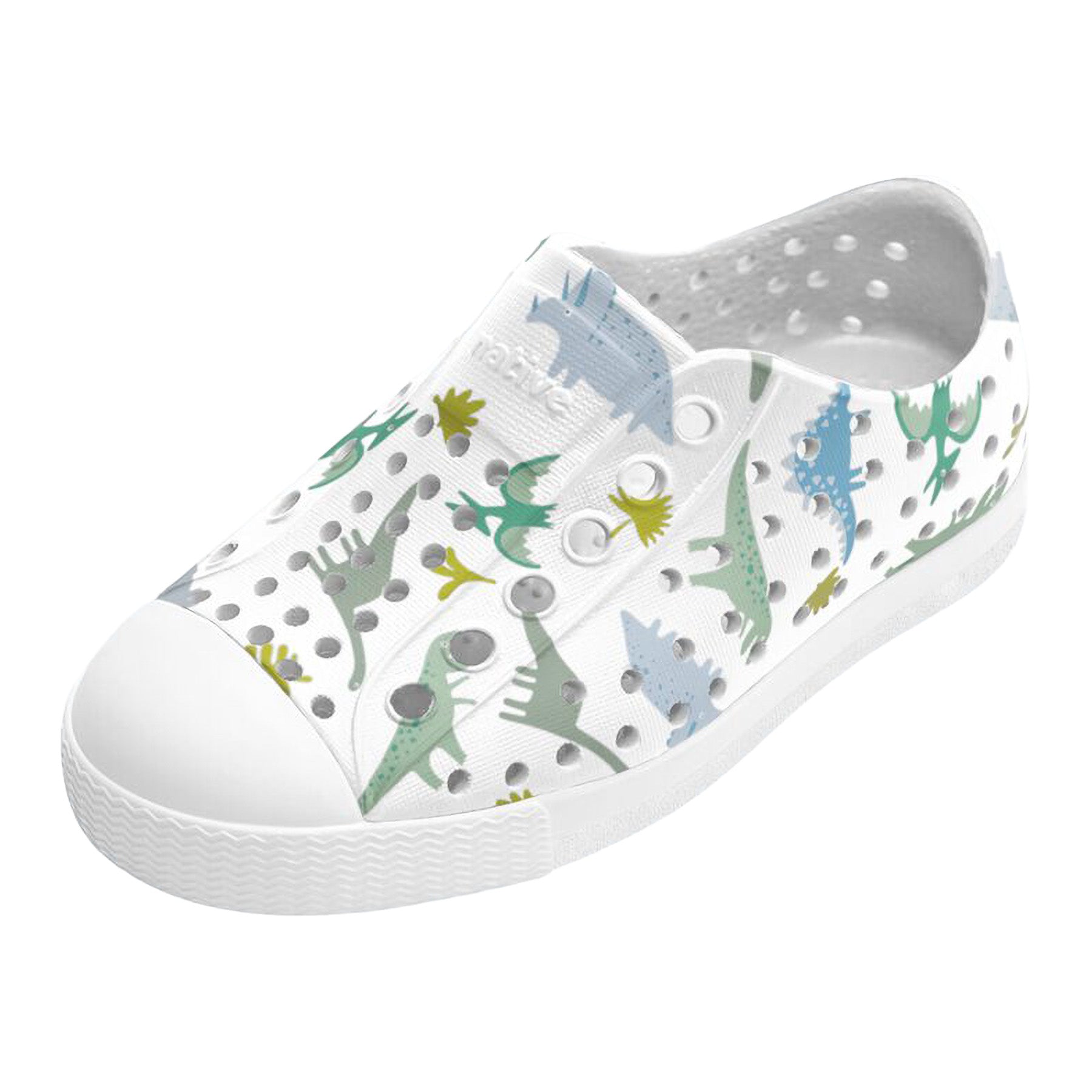 Native Jefferson Print in Flux Alpine Dino brings prehistoric fun to everyday adventures with playful dinosaurs in soft greens and blues on a clean white base. Made from ultra-lightweight EVA, this water-friendly classic keeps little feet cool with Native’s signature perforations and a cushioned feel for all-day play. The odor-resistant, hand-washable build makes cleanup simple after park days and puddle jumps, while the sturdy white toe cap adds durability. Easy slip-on styling lets kids get out the door fast.